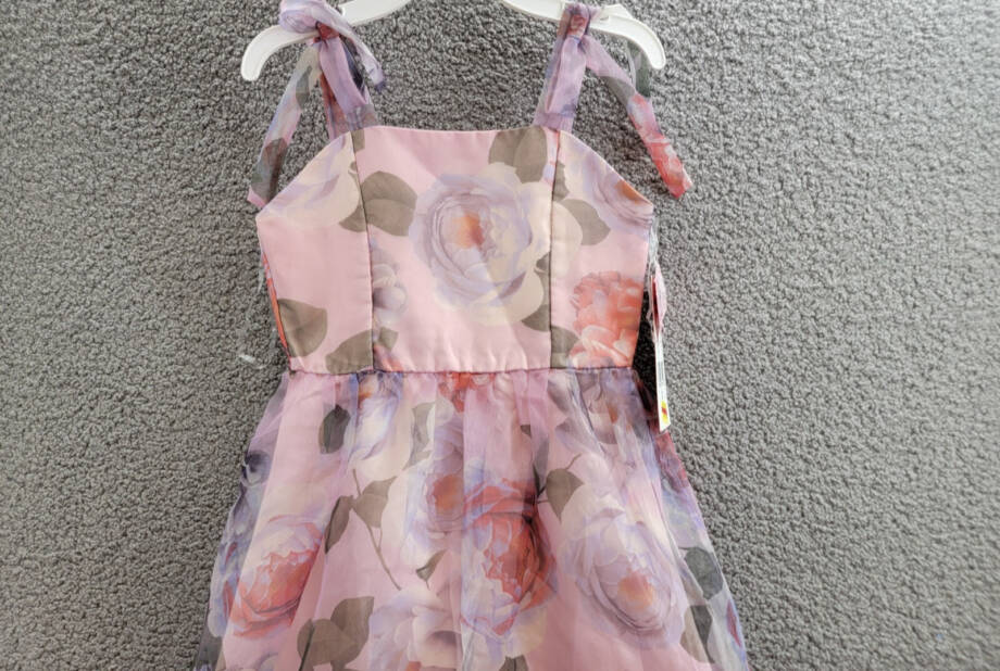 Crafted from 100% polyester, the garment is designed to be hand-washed, ensuring lasting beauty and quality. The dress’s long, sleeveless design paired with a collarless feature creates a seamless silhouette, while the bow and zipper accents add a touch of whimsy. Sized at 10 with a chest size of 28 inches and waist size of 26 inches, it’s a timeless addition to any girl’s wardrobe.